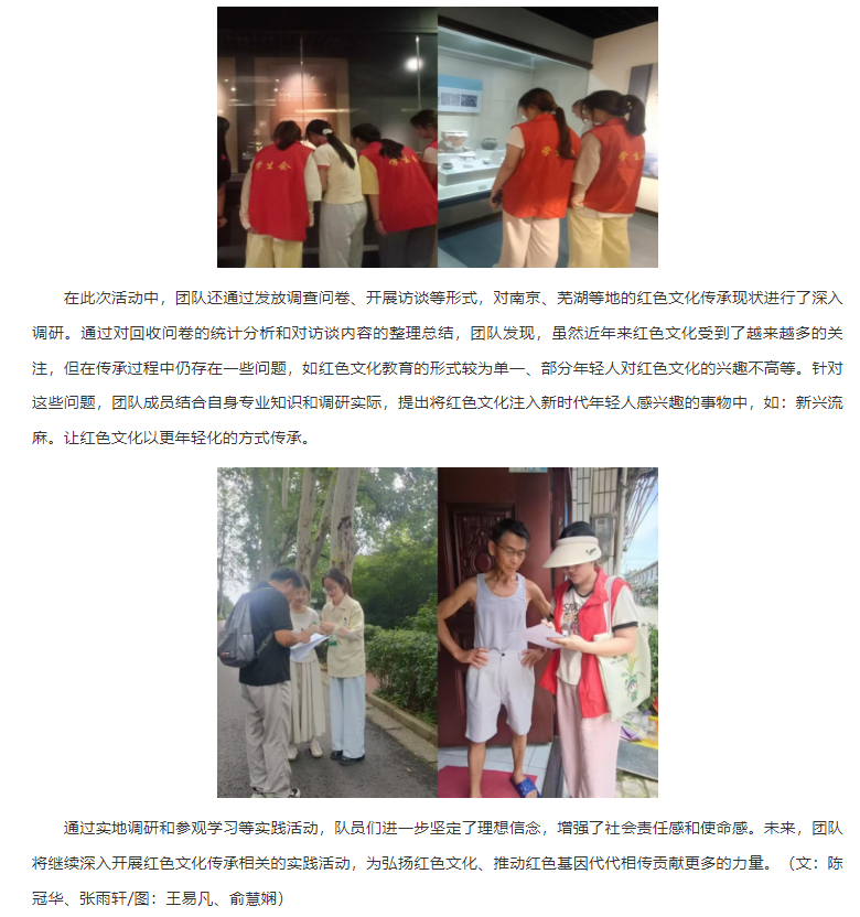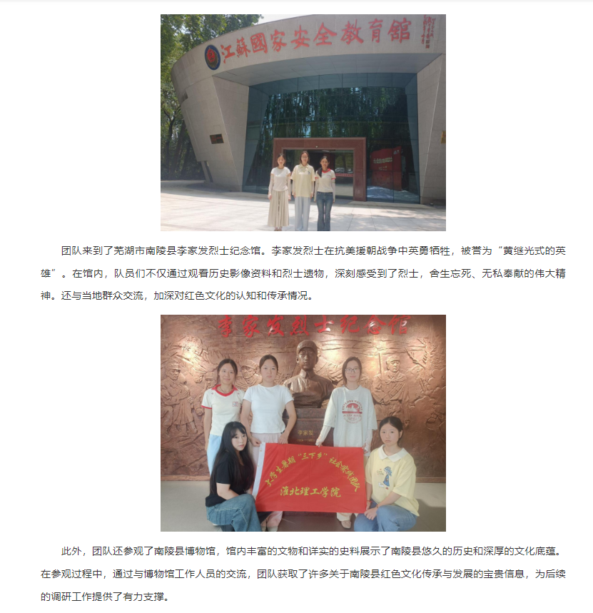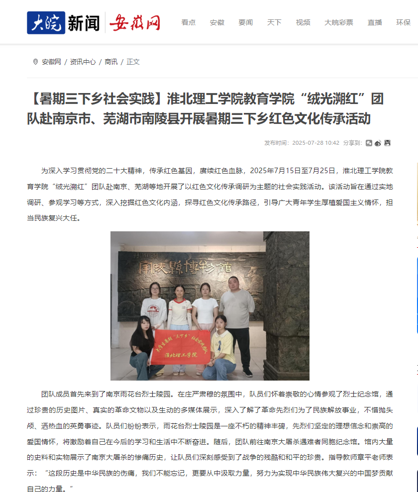 为深入学习贯彻党的二十大精神,传承红色基因,赓续红色血脉,2025年7月15日至7月25日,淮北理工学院教育学院“绒光溯红”团队赴南京、芜湖等地开展了以红色文化传承调研为主题的社会实践活动。该活动旨在通过实地调研、参观学习等方式,深入挖掘红色文化内涵,探寻红色文化传承路径,引导广大青年学生厚植爱国主义情怀,担当民族复兴大任。对此,安徽网进行了报道: