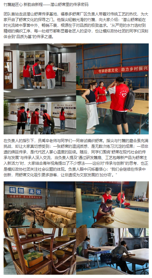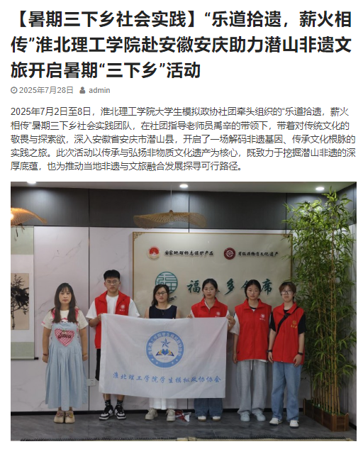2025年7月2日至8日,淮北理工学院大学生模拟政协社团牵头组织的“乐道拾遗,薪火相传”暑期三下乡社会实践团队,在社团指导老师员禹辛的带领下,带着对传统文化的敬畏与探索欲,深入安徽省安庆市潜山县,开启了一场解码非遗基因、传承文化根脉的实践之旅。此次活动以传承与弘扬非物质文化遗产为核心,既致力于挖掘潜山非遗的深厚底蕴,也为推动当地非遗与文旅融合发展探寻可行路径。对此,中国青年日报: