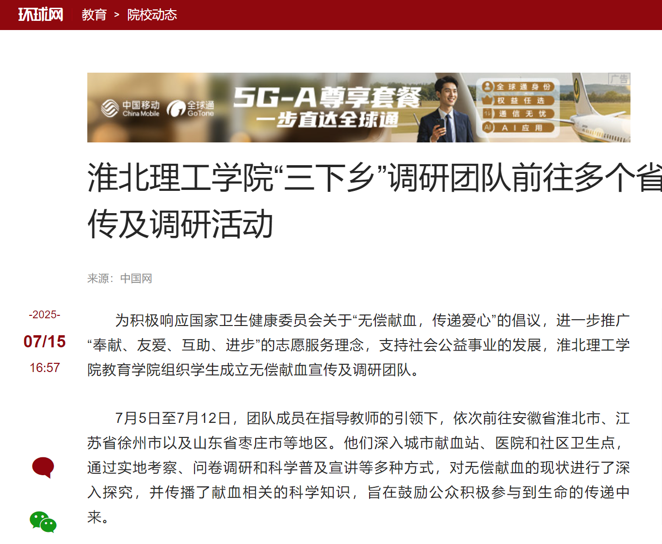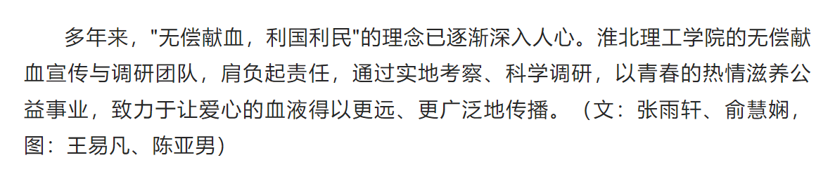为积极响应国家卫生健康委员会关于“无偿献血,传递爱心”的倡议,进一步推广“奉献、友爱、互助、进步”的志愿服务理念,支持社会公益事业的发展,淮北理工学院教育学院组织学生成立无偿献血宣传及调研团队。对此,环球网进行了报道: