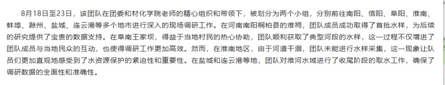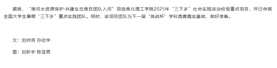 淮河流域是中国重要的流域之一,是生态文明的重要载体,淮北理工学院能源材料与化工学院与青马工程学员联合组队,积极响应共青团中央开展的‘淮河水资源保护’活动,以青春力量开展调研,助力“双碳”目标实现,让绿色发展理念深入人心,以公益行动践行生态保护,为“生态淮河”建设注入团员青年青春力量。对此,长江网进行了报道:
