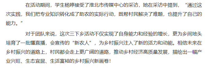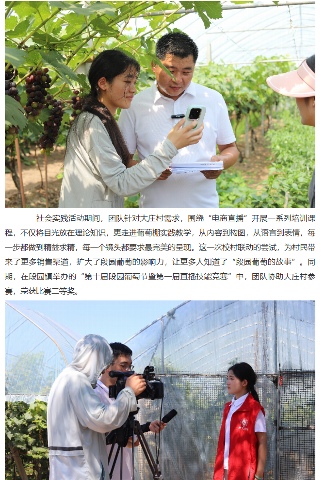 2025年7月2日,淮北理工学院经济与管理学院“赴段园镇大庄村校村联动爱心助农“社会实践团队深入杜集区段园镇大庄村,以 “田间课堂 + 理论培训” 为核心模式,深入当地开展 “一村一主播” 三下乡项目实践。从高校校园到田间地头,从教师赋能学生到师生携手培育 “新农人”,团队紧扣乡村振兴主题,以电商直播为核心,把专业知识带到田间地头,为销售渠道探索新路径。对此,中国教育晚报进行了报道: