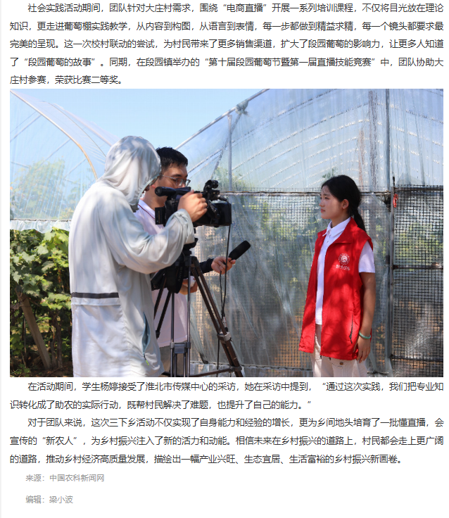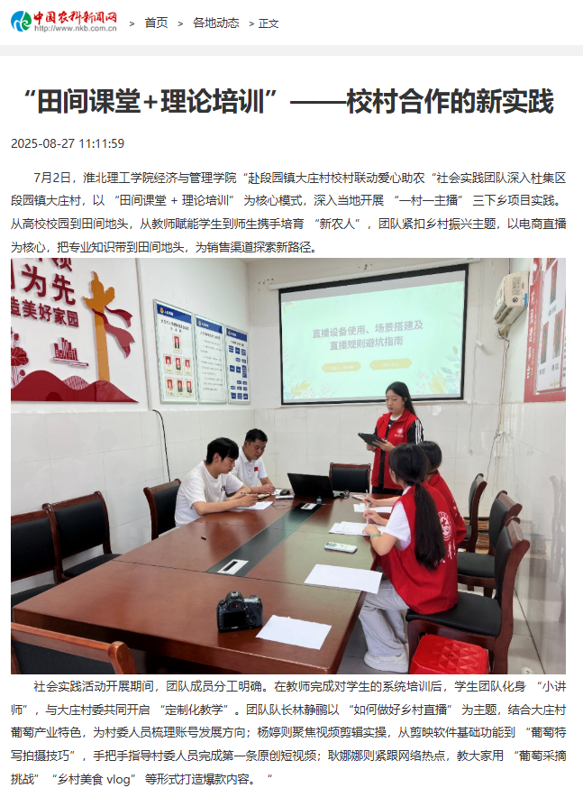 7月2日,淮北理工学院经济与管理学院“赴段园镇大庄村校村联动爱心助农“社会实践团队深入杜集区段园镇大庄村,以“田间课堂 +理论培训”为核心模式,深入当地开展“一村一主播”三下乡项目实践。从高校校园到田间地头,从教师赋能学生到师生携手培育“新农人”,团队紧扣乡村振兴主题,以电商直播为核心,把专业知识带到田间地头,为销售渠道探索新路径。对此,中国农科新闻网进行了报道: