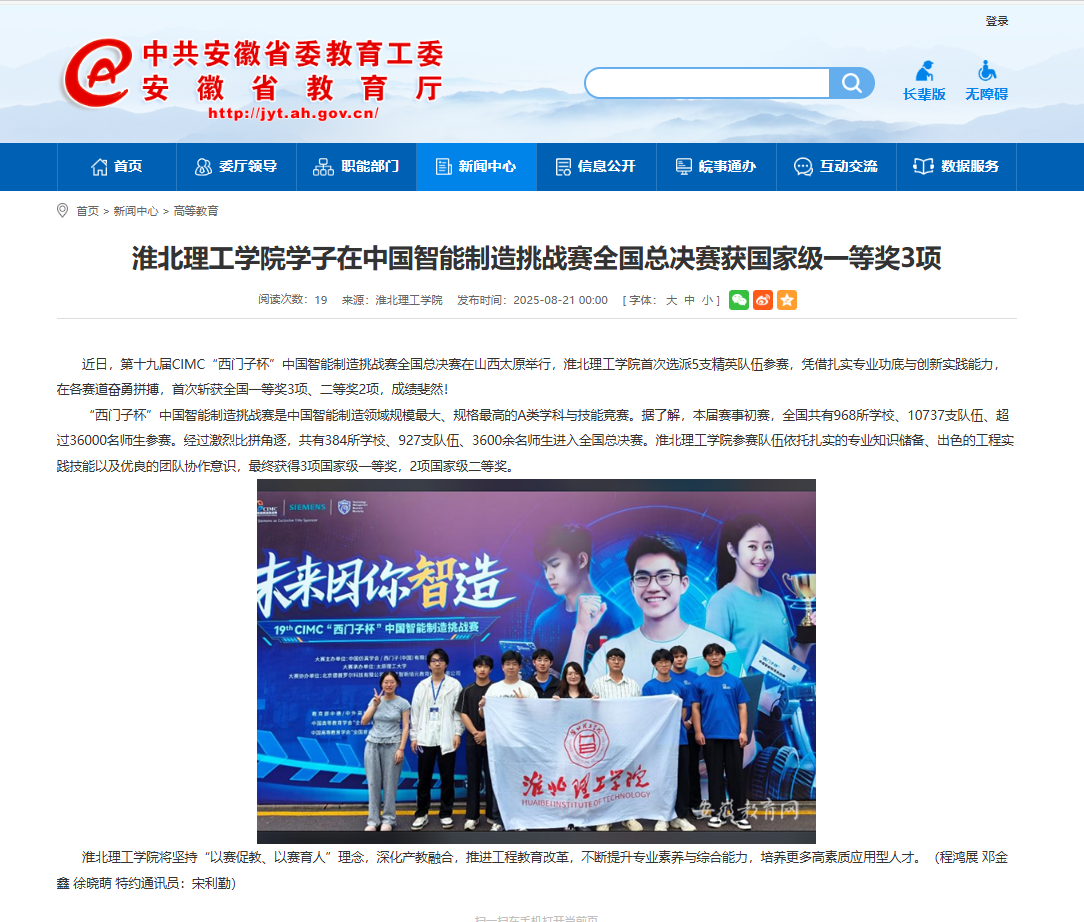 近日,第十九届CIMC“西门子杯”中国智能制造挑战赛全国总决赛在山西太原举行,淮北理工学院首次选派5支精英队伍参赛,凭借扎实专业功底与创新实践能力,在各赛道奋勇拼搏,首次斩获全国一等奖3项、二等奖2项,成绩斐然!对此,安徽教育网进行了报道: