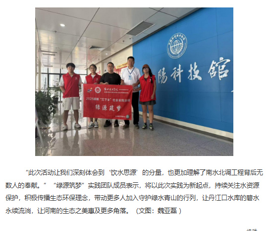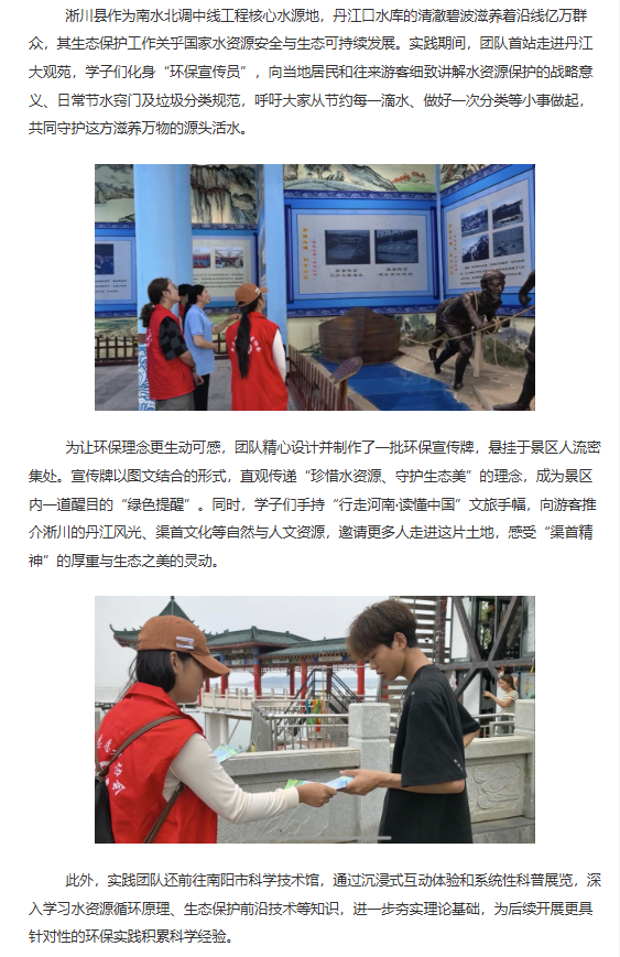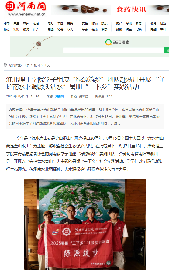 今年是“绿水青山就是金山银山”理念提出20周年,8月15日全国生态日以“绿水青山就是金山银山”为主题,凝聚全社会生态保护共识。在此背景下,8月7日至13日,淮北理工学院常青藤志愿者协会的河南籍学子组建“绿源筑梦”实践团队,奔赴河南省南阳市淅川县,开展以“守护绿水青山”为主题的暑期“三下乡”社会实践活动。学子们以实际行动践行生态理念,传承南水北调精神,为水源保护与环保宣传注入青春力量。对此,河南网进行了报道: