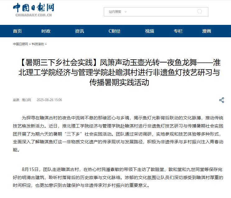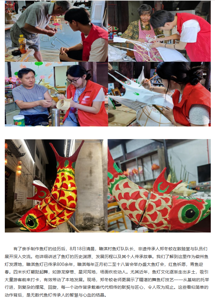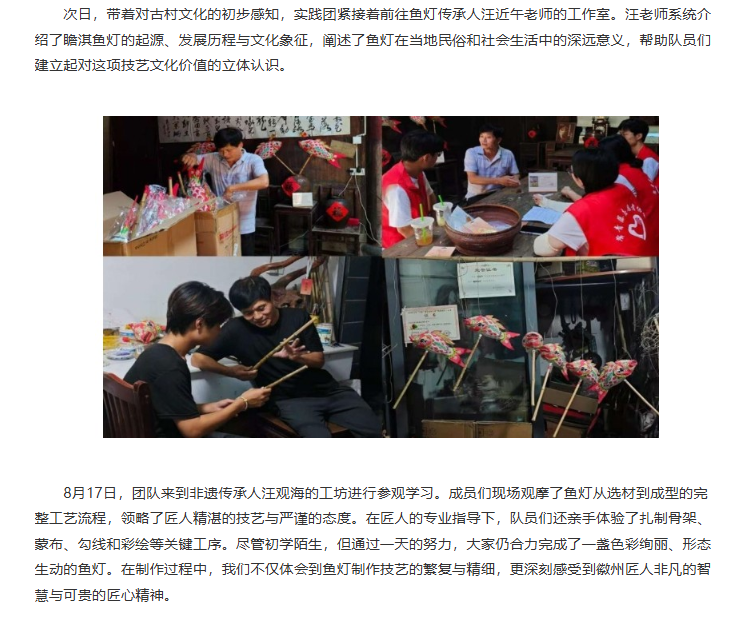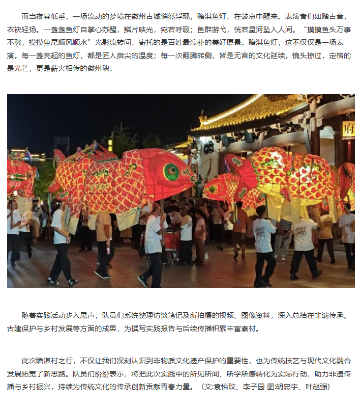 为探寻在瞻淇古村的夜色中流转不息的那缕匠心与乡魂,揭示鱼灯光影背后跃动的文化脉搏,推动传统技艺焕发新活力。近日,淮北理工学院经济与管理学院赴瞻淇村进行非遗鱼灯技艺研习与传播暑期社会实践团开展了为期六天的暑期“三下乡”社会实践活动。团队通过采访调研、实地参观和技艺体验等多种形式,全面深入了解瞻淇鱼灯这一非物质文化遗产的传承现状与发展路径,积极为非遗传承与乡村振兴注入青春动能。对此,中国日报网进行了报道: