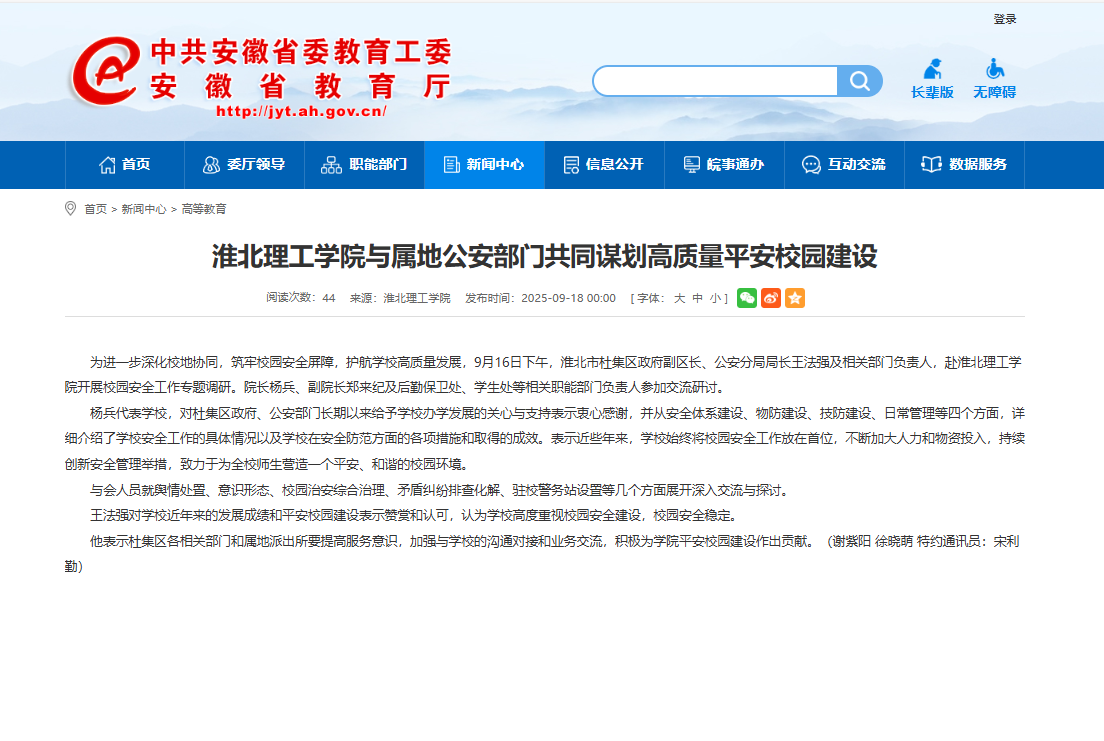为进一步深化校地协同,筑牢校园安全屏障,护航学校高质量发展,9月16日下午,淮北市杜集区政府副区长、公安分局局长王法强及相关部门负责人,赴淮北理工学院开展校园安全工作专题调研。院长杨兵、副院长郑来纪及后勤保卫处、学生处等相关职能部门负责人参加交流研讨。对此,安徽教育网进行了报道: