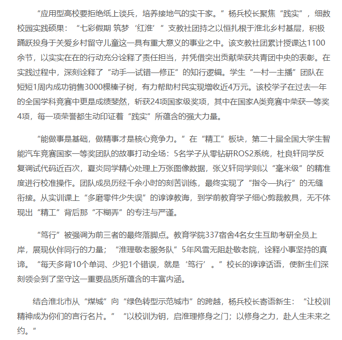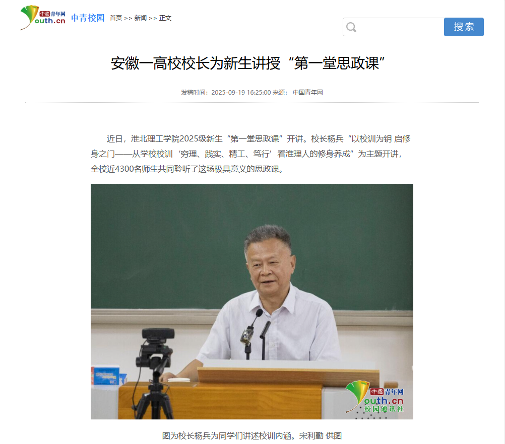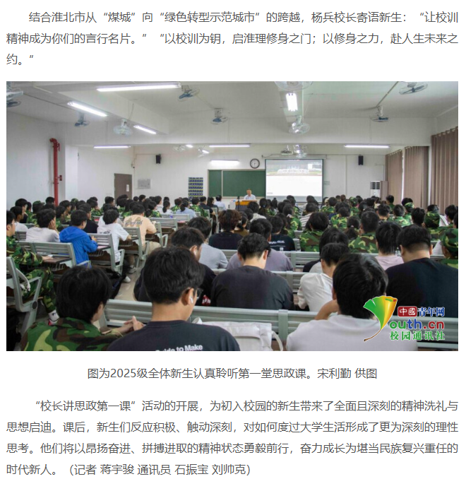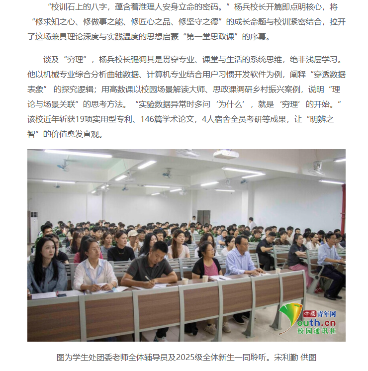 近日,淮北理工学院2025级新生“第一堂思政课”开讲。校长杨兵“以校训为钥 启修身之门——从学校校训‘穷理、践实、精工、笃行’看淮理人的修身养成”为主题开讲,全校近4300名师生共同聆听了这场极具意义的思政课。对此,中国青年网进行了报道: