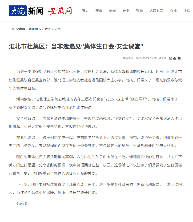 为进一步加强对乡村青少年的关心关爱,传递社会温暖,营造温馨和谐的成长氛围,近日,团淮北市杜集区委联合区委宣传部、淮北理工学院支教社走进段园镇大庄小学,为孩子们带来了一场充满爱意与欢乐的集体生日会。对此,安徽网进行了报道: