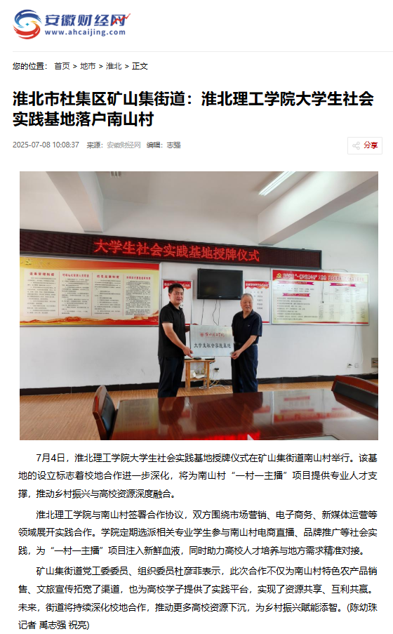 7月4日,淮北理工学院大学生社会实践基地授牌仪式在矿山集街道南山村举行。该基地的设立标志着校地合作进一步深化,将为南山村“一村一主播”项目提供专业人才支撑,推动乡村振兴与高校资源深度融合。对此,安徽财经网进行了报道: