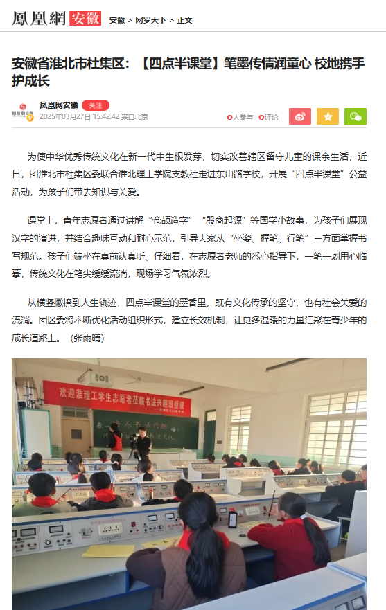 为使中华优秀传统文化在新一代中生根发芽,切实改善辖区留守儿童的课余生活,近日,团淮北市杜集区委联合淮北理工学院支教社走进东山路学校,开展“四点半课堂”公益活动,为孩子们带去知识与关爱。对此,凤凰网安徽进行了报道:
