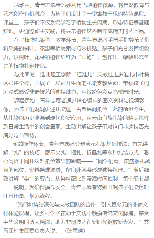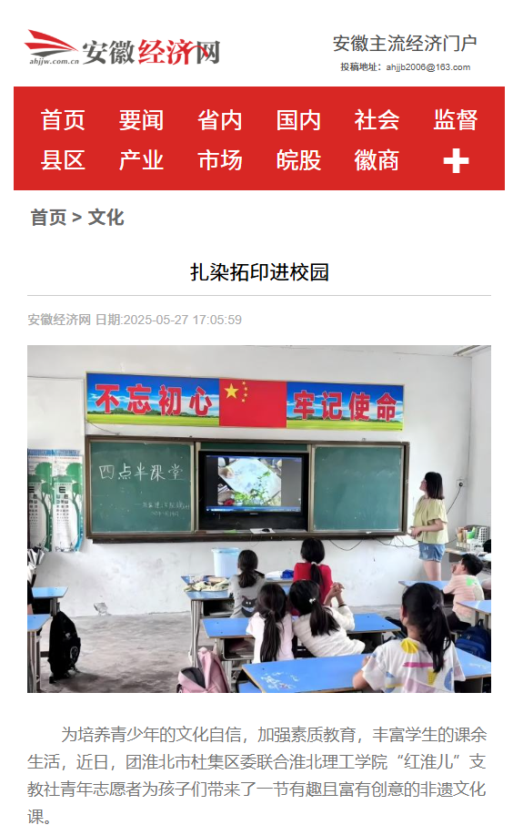 为培养青少年的文化自信,加强素质教育,丰富学生的课余生活,近日,团淮北市杜集区委联合淮北理工学院“红淮儿”支教社青年志愿者为孩子们带来了一节有趣且富有创意的非遗文化课。对此,安徽经济网进行了报道: