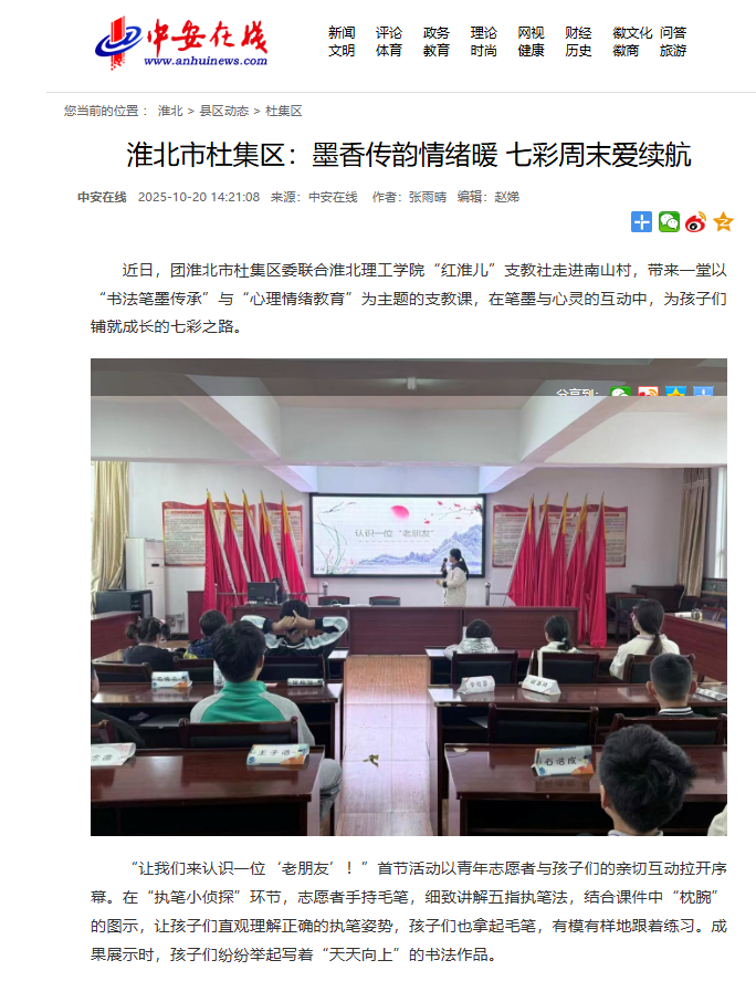 近日,团淮北市杜集区委联合淮北理工学院“红淮儿”支教社走进南山村,带来一堂以“书法笔墨传承”与“心理情绪教育”为主题的支教课,在笔墨与心灵的互动中,为孩子们铺就成长的七彩之路。对此,中安在线进行了报道:
