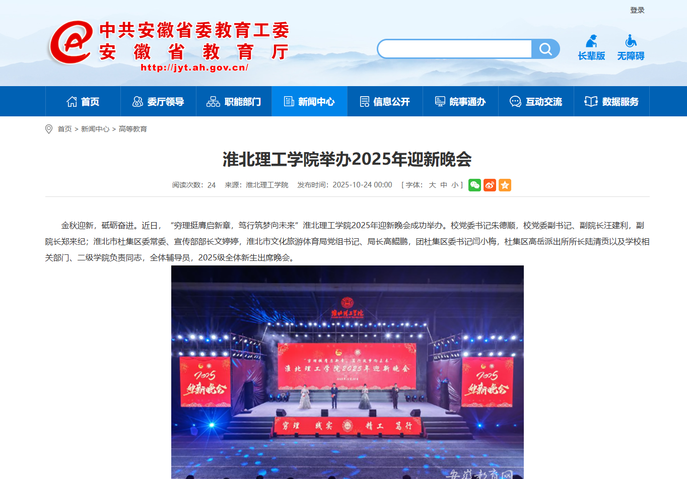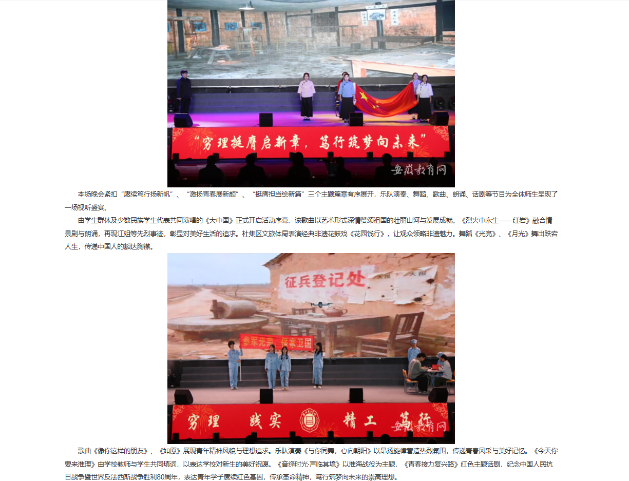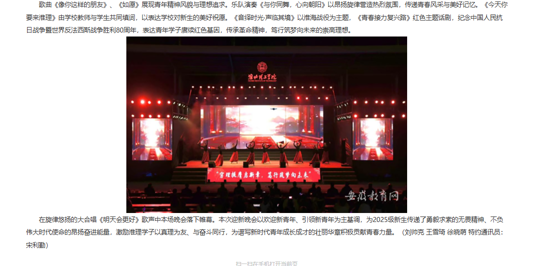 金秋迎新,砥砺奋进。近日,“穷理挺膺启新章,笃行筑梦向未来”淮北理工学院2025年迎新晚会成功举办。校党委书记朱德顺,校党委副书记、副院长汪建利,副院长郑来纪;淮北市杜集区委常委、宣传部部长文婷婷,淮北市文化旅游体育局党组书记、局长高鲲鹏,团杜集区委书记闫小梅,杜集区高岳派出所所长陆清贡以及学校相关部门、二级学院负责同志,全体辅导员,2025级全体新生出席晚会。 对此,安徽教育网进行了报道: