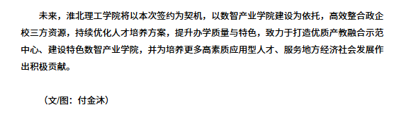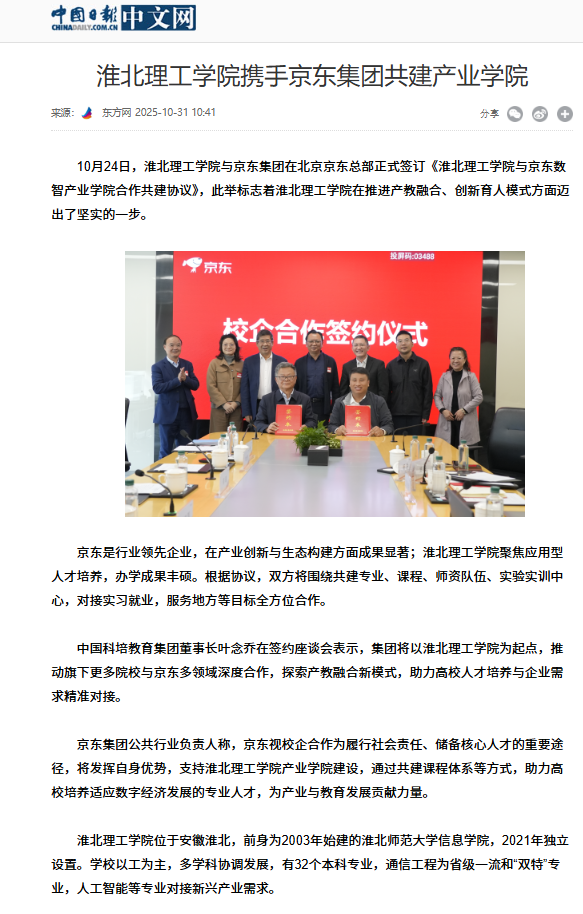 10月24日,淮北理工学院与京东集团在北京京东总部正式签订《淮北理工学院与京东数智产业学院合作共建协议》,此举标志着淮北理工学院在推进产教融合、创新育人模式方面迈出了坚实的一步。对此,中国日报网进行了报道: