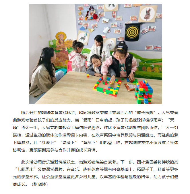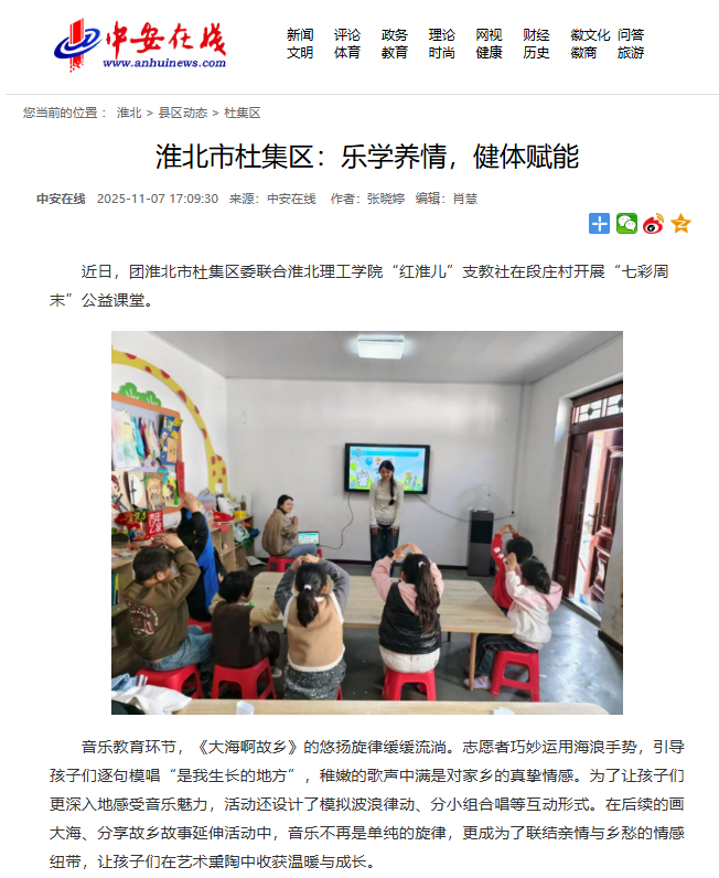 近日,团淮北市杜集区委联合淮北理工学院“红淮儿”支教社在段庄村开展“七彩周末”公益课堂。对此,中安在线进行了报道: