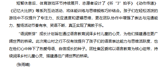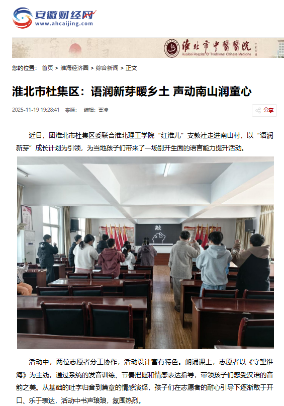 近日,团淮北市杜集区委联合淮北理工学院“红淮儿”支教社走进南山村,以“语润新芽”成长计划为引领,为当地孩子们带来了一场别开生面的语言能力提升活动。对此,安徽财经网进行了报道: