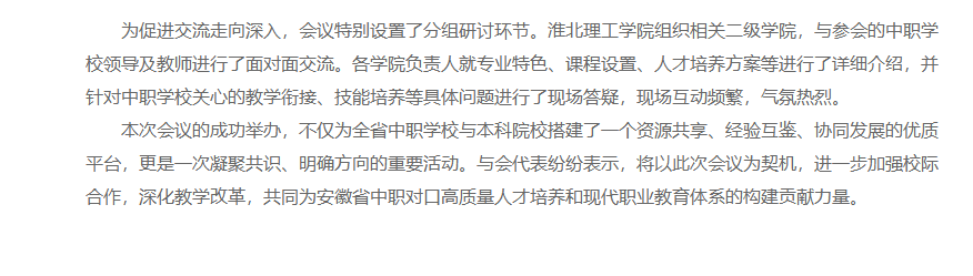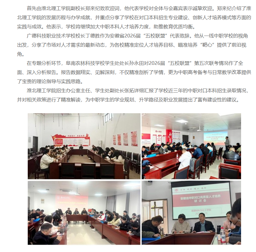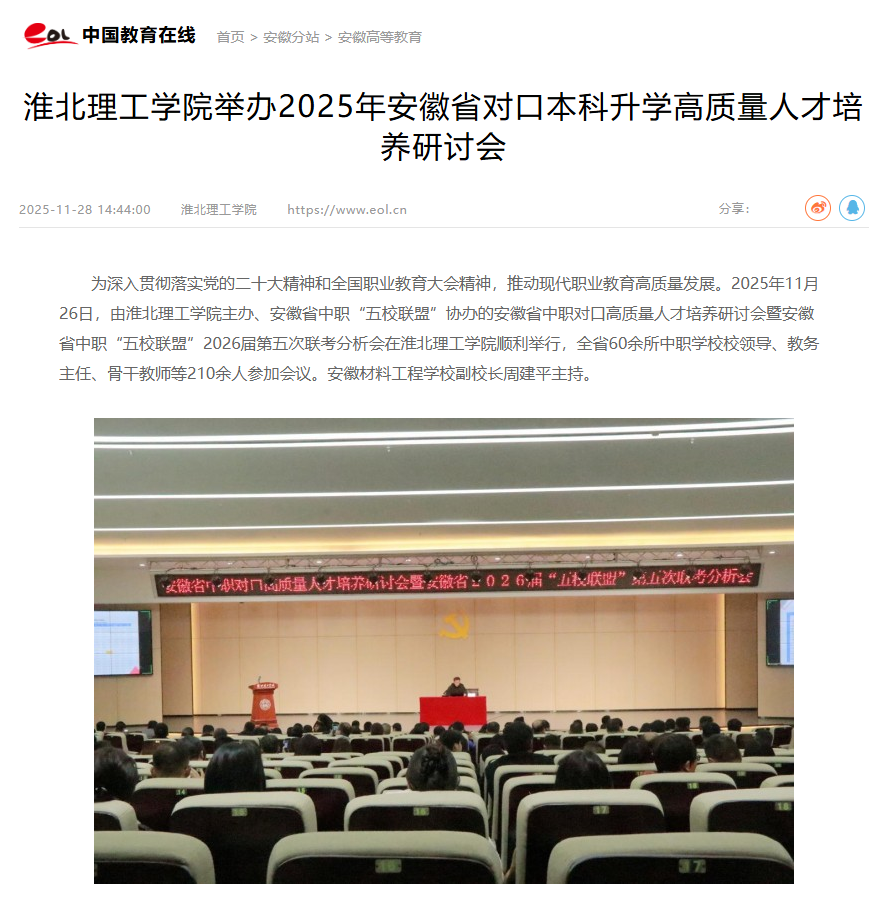 为深入贯彻落实党的二十大精神和全国职业教育大会精神,推动现代职业教育高质量发展。2025年11月26日,由淮北理工学院主办、安徽省中职“五校联盟”协办的安徽省中职对口高质量人才培养研讨会暨安徽省中职“五校联盟”2026届第五次联考分析会在淮北理工学院顺利举行,全省60余所中职学校校领导、教务主任、骨干教师等210余人参加会议。安徽材料工程学校副校长周建平主持。对此,中国教育在线进行了报道: