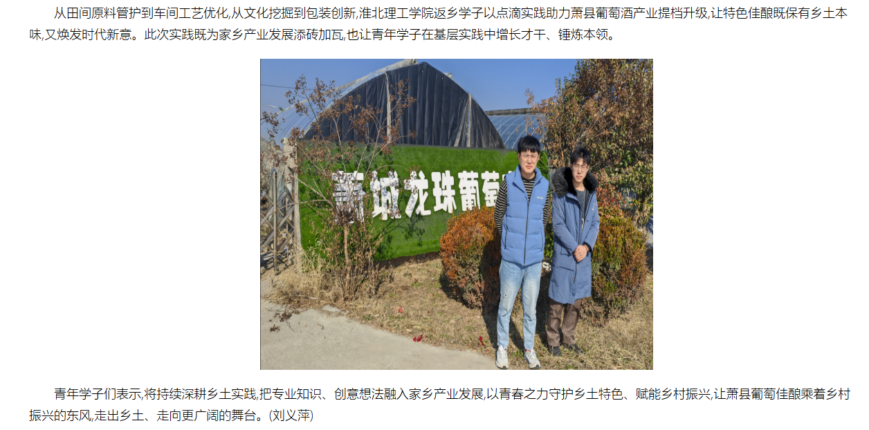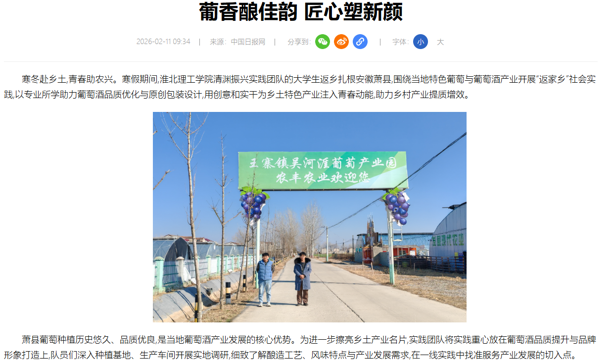 寒冬赴乡土,青春助农兴。寒假期间,淮北理工学院清渊振兴实践团队的大学生返乡扎根安徽萧县,围绕当地特色葡萄与葡萄酒产业开展“返家乡”社会实践,以专业所学助力葡萄酒品质优化与原创包装设计,用创意和实干为乡土特色产业注入青春动能,助力乡村产业提质增效。对此,中国网进行了报道:
