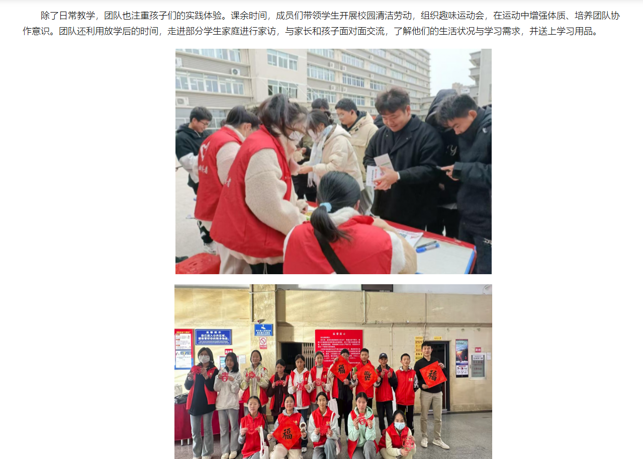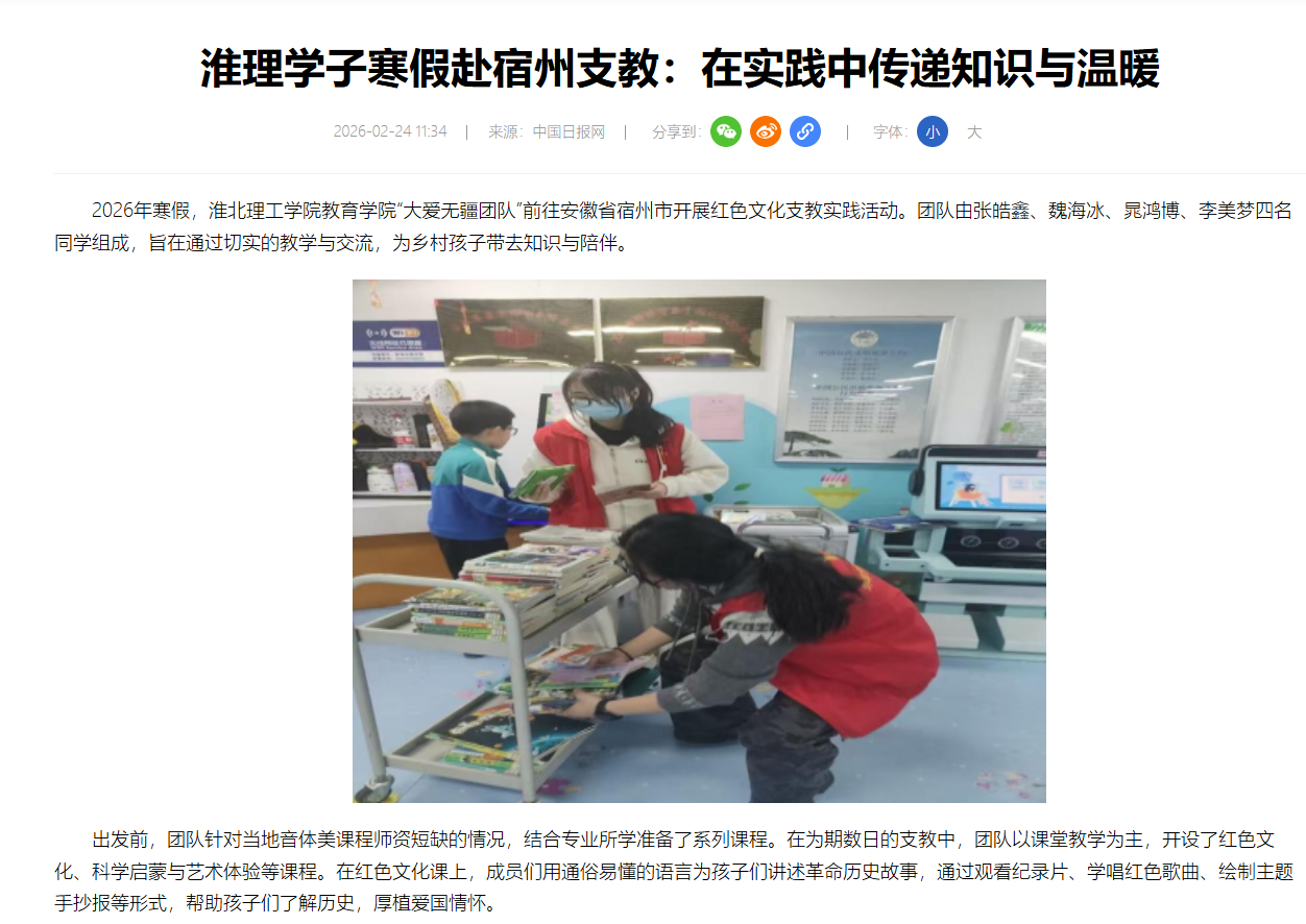 2026年寒假,淮北理工学院教育学院“大爱无疆团队”前往安徽省宿州市开展红色文化支教实践活动。团队由张皓鑫、魏海冰、晁鸿博、李美梦四名同学组成,旨在通过切实的教学与交流,为乡村孩子带去知识与陪伴。对此,中国网进行了报道: