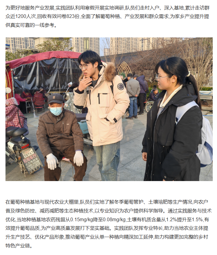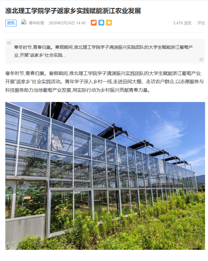 寒冬时节,青春归巢。寒假期间,淮北理工学院学子清渊振兴实践团队的大学生赋能浙江葡萄产业,开展“返家乡”社会实践活动。青年学子深入乡村一线,走进田间大棚、走访农户群众,以志愿服务与科技服务助力当地葡萄产业发展,用实际行动为乡村振兴贡献青春力量。对此,青年时报进行了报道: