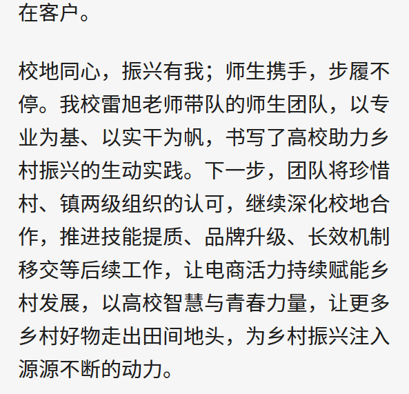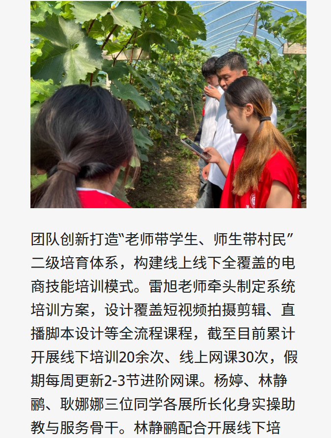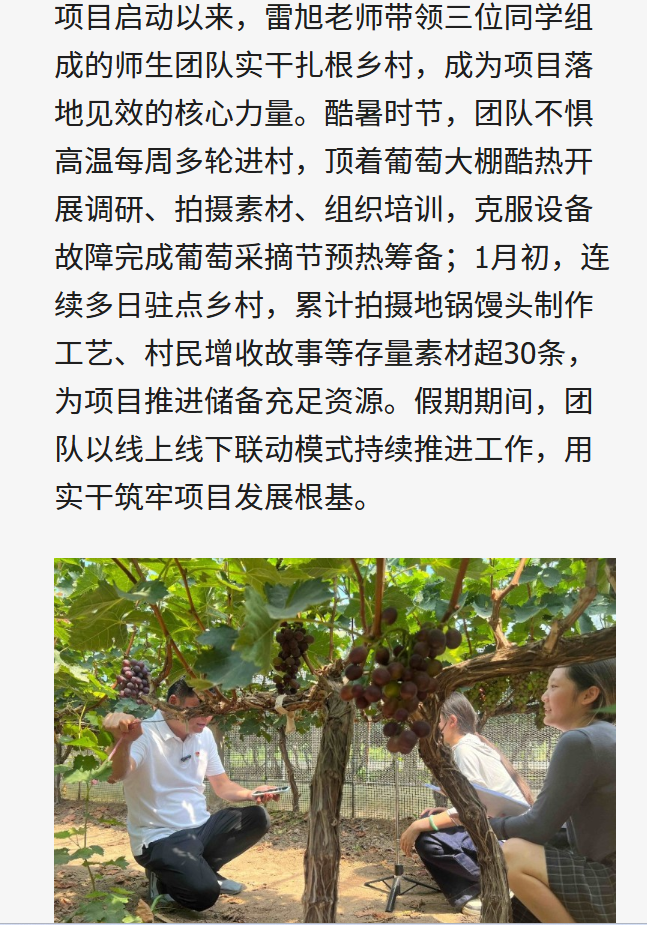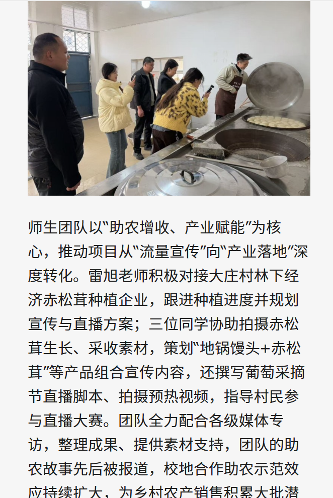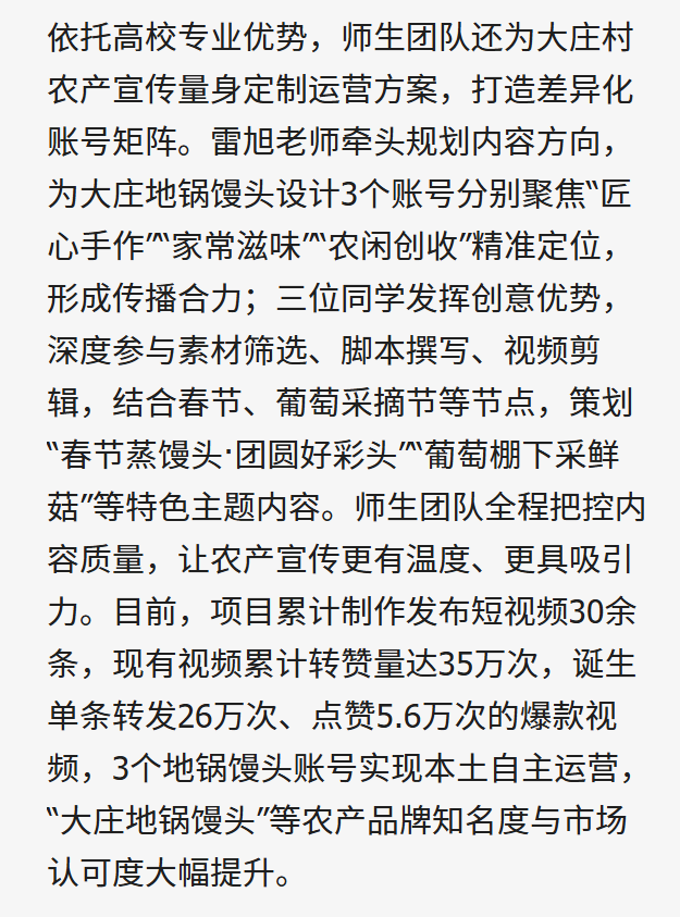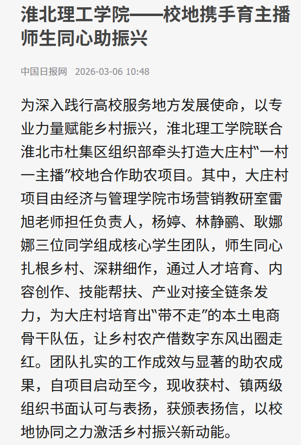 为深入践行高校服务地方发展使命,以专业力量赋能乡村振兴,淮北理工学院联合淮北市杜集区组织部牵头打造大庄村“一村一主播”校地合作助农项目。其中,大庄村项目由经济与管理学院市场营销教研室雷旭老师担任负责人,杨婷、林静鹂、耿娜娜三位同学组成核心学生团队,师生同心扎根乡村、深耕细作,通过人才培育、内容创作、技能帮扶、产业对接全链条发力,为大庄村培育出“带不走”的本土电商骨干队伍,让乡村农产借数字东风出圈走红。团队扎实的工作成效与显著的助农成果,自项目启动至今,现收获村、镇两级组织书面认可与表扬,获颁表扬信,以校地协同之力激活乡村振兴新动能。对此,环球日报进行了报道: